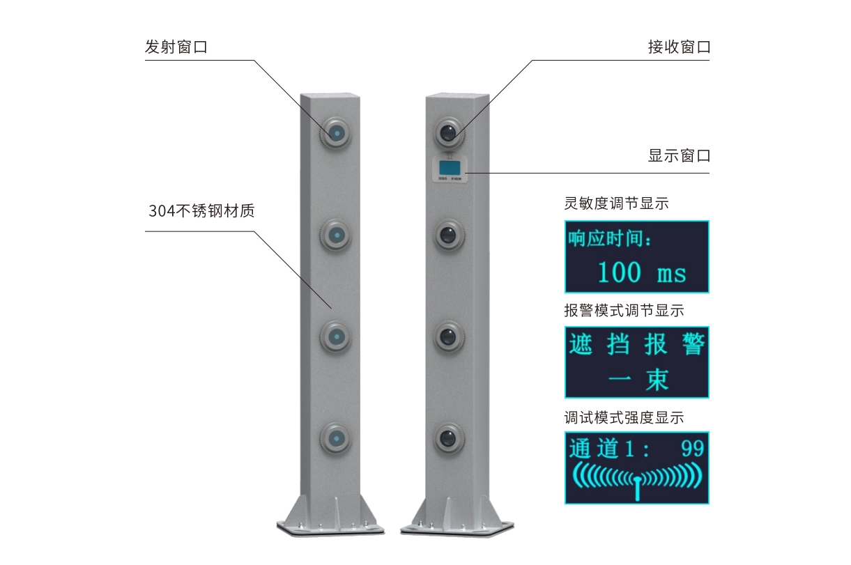 Gp系列激光入侵探测器分为八光束、六光束、四光束、双光束、单光束共五种系列,全系列采用304不锈钢材质,以激光光束为警戒线,采用单层或多层互射方式,以发射和接受两个端口为防范单元 ,可连续布设并通过报警主机联动其它设备,如 :报警设备、监控设备、语音设备、显示大屏等 ;实现稳定、可靠、安全、安心的物理防范;